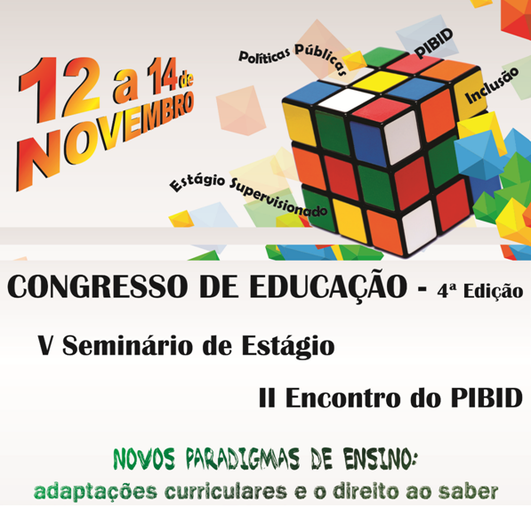 2014O IV Congresso de Educação da UEG de Iporá, V Seminário de Estágio Supervisionado, II Encontro PIBID tem o objetivo de propiciar a reflexão acerca dos novos paradigmas do ensino engendrados na universidade e nas escolas do ensino básico nessas duas primeiras décadas do século XXI. O evento tem por tema os NOVOS PARADIGMAS DE ENSINO: ADAPTAÇÕES CURRICULARES E O DIREITO AO SABER. Realizaremos uma discussão com a comunidade acadêmica constituída por professores e acadêmicos dos Cursos de Licenciatura de Ciências Biológicas, Geografia, História, Letras e Matemática, os profissionais da educação que atuam nas redes de educação básica e egressos que ainda não conseguiram adentrar no mercado de trabalho educacional.