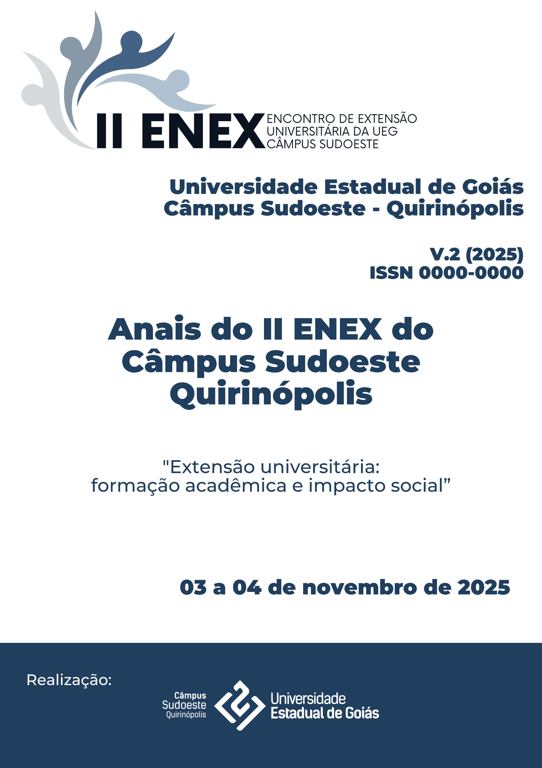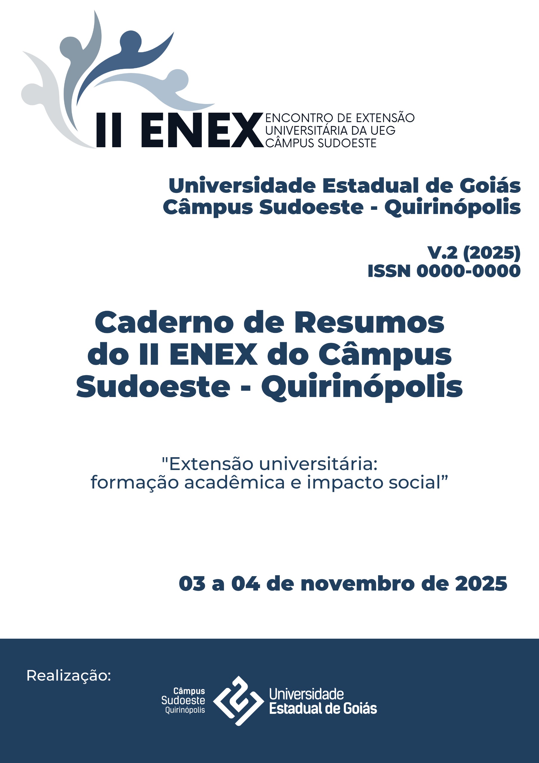 O segundo número dos Anais do Encontro de Extensão Universitária da UEG Câmpus Sudoeste busca divulgar os trabalhos apresentados na segunda edição do evento, que ocorreu nos dias 03 e 04 de novembro de 2025. Então, a partir da discussão da temática “Extensão universitária: formação acadêmica e impacto social”, buscou-se elucidar o quanto a extensão se constitui enquanto eixo multidimensional e de transformação social significativo para todos os sujeitos envolvidos no processo. Para os estudantes universitários, a extensão se mostra como espaço de compartilhamento de conhecimentos e experiências, o qual promove uma atuação mais próxima da realidade e da prática profissional, estabelecendo uma formação mais sólida e com valores profissionais mais humanizados. Para a comunidade, as ações extensionistas funcionam como um lugar de escuta, de oportunidade e de troca de saberes, o que é fundamental para uma atuação emancipatória frente às diferentes demandas e dimensões sociais, como trabalho, educação, cultura, meio ambiente, saúde e justiça. Ao todo, vinte e quatro trabalhos foram aprovados, totalizando a participação de sessenta e nove apresentadores no evento. Nessa direção, encontram-se nos Anais do II ENEX textos que sinalizam os resultados e as experiências das ações extensionistas apresentadas no evento.