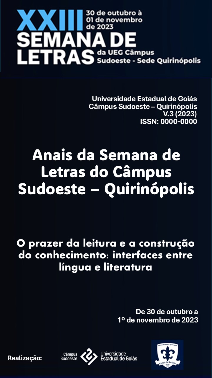 v. 3 n. 1 (2023)Em 2023, a XXIII Semana de Letras discutiu o tema: “O prazer da leitura e a construção do conhecimento: interfaces entre Língua e Literatura”, com os objetivos: de apresentar algumas discussões pertinentes sobre a língua portuguesa do Brasil; de promover práticas de incentivo à leitura literária; e de divulgar todas as pesquisas desenvolvidas pelos discentes do curso de Letras. Desse modo, o presente evento estabeleceu um espaço interativo de troca de conhecimentos, debates científicos, e compartilhamento de experiências em suas diferentes ações: palestras, minicursos e apresentações de trabalhos. Visto isso, divulga-se a partir dos Anais desta edição o Caderno de Resumos do evento, o qual contempla os textos que discutem os treze trabalhos apresentados no evento enquanto comunicação oral.